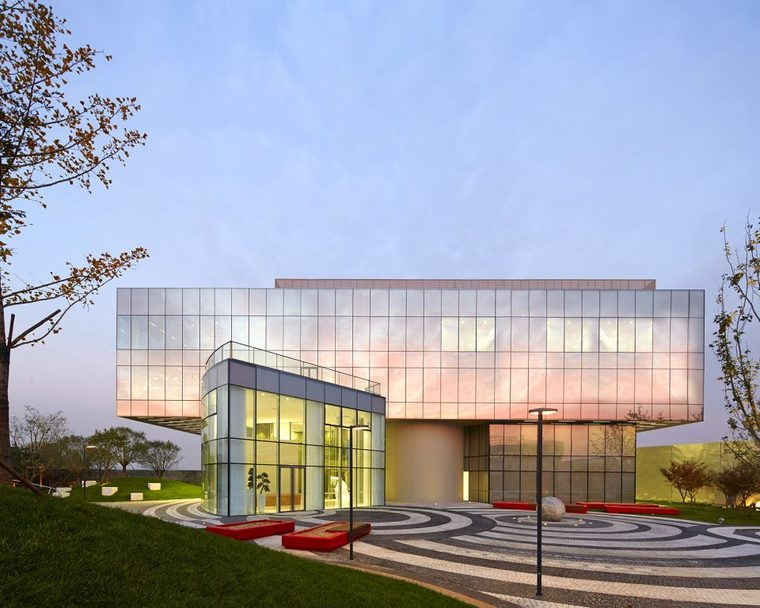硬质景观同心圆的组成与禅意花园的组成,在视觉上建立了非常强烈的联系。同时也创造了强大的中心感及集散空间。停车广场的中心也强化了禅意的传统:一棵造型油松,规则条状种植的大叶黄杨篱及两个巨大匍匐的巨石构成不对称的特色元素。当走向建筑时,会遇到一个7.6吨重的风水球。花岗岩风水球静静的在薄薄的水面上转动,用一个大手笔来诠释一个通俗的中国造园元素。