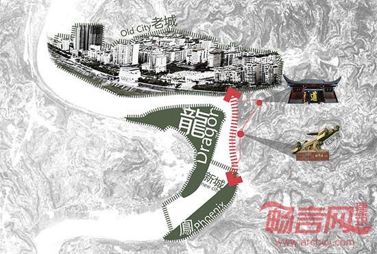 设计手法:龙凤戏珠为著名的传统中国特色图案。龙飞凤舞,一颗火珠被围绕其中,代表着繁荣及昌盛,也传递了龙凤呈祥的美好愿景。苍溪杜里坝以龙为主,赵工坝则以凤作题,红军渡节点接下来作为被重点打造区域,取火珠之寓意,使这幅苍溪新城区的龙凤戏珠图得以完满。