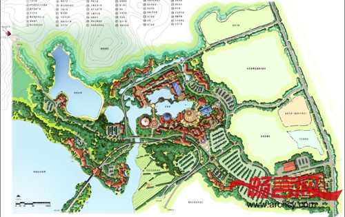 热带香巴拉——项目场地南部为赤田水库及分支水系,西北及西南则是连绵的山脉将其包围,具有背山面水的环境资源,场地中部也有毛民水库、水塘及水渠等丰富的水体资源。整体规划充分利用了现有水库资源和山体资源以及自然地势进行设计,并结合商业街、主要景观大道等进行景观节点的有机联系,为游客提供可视、可享、可感的连续多样的旅游度假环境。依托现有的外部交通道路和车流、人流来向等因素,园区的主入口设置于东南部。园内主要有十四个功能区:核心文化商业区、特色酒店区、雨林主题酒店区、旅游小镇区、高端酒店区、农田景观区、生态停车区、员工宿舍区、水库景观区、生态休闲区、汽车旅馆区、管理区、雕塑园区以及旅游小镇等。整体布局顺应地势,由一条自由布局的主路结合主环路和文化商业街区内步行系统将各功能区有机联系,同时辅以次级道路、VIP通道以及铁路,可满足内外交通的多元化需求,并根据需要配置相应的停车设施。