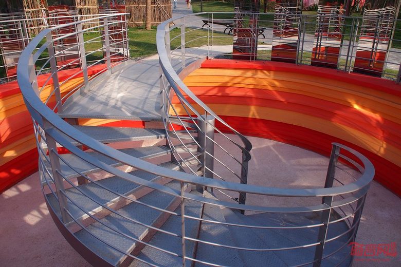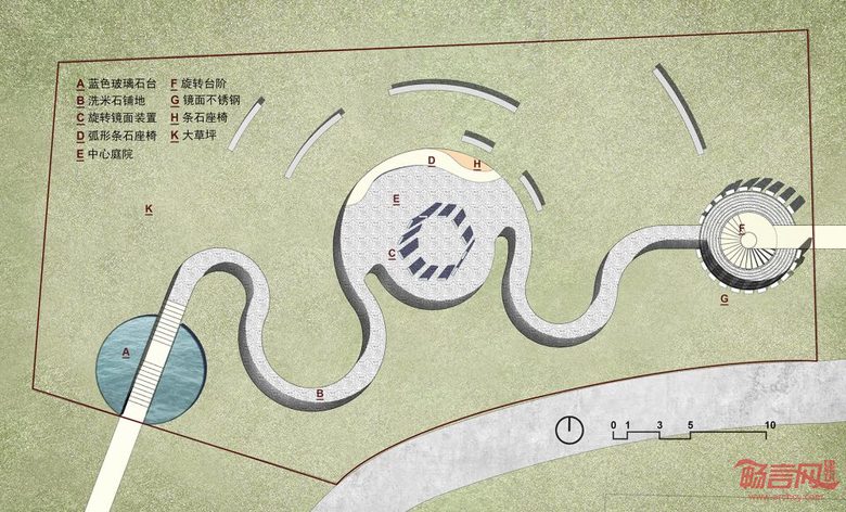 沉淀园东西长50米,南北宽20米左右,面积狭小。作为唯一一个深挖的展园,设计师将其下沉3米,利用一条1.2米宽的彩色“峡谷”在极小的展园内实现了长达150米长的游园动线,曲径通幽的流线恰似“桃花源记”中对未知探索的奇趣。峡谷中创造了两个大的空间节点,开合有致,与狭窄的巷道产生鲜明的对比。地面上的人可以扶着矮墙观看并与峡谷中的游人进行互动,并告知其未知前方的情况。