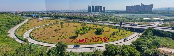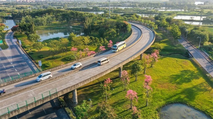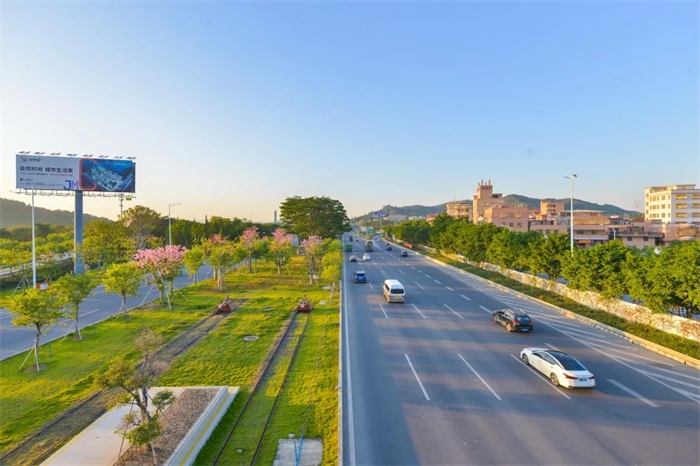 改造后的广明高速荷城出口,拥有了更具层次感的绿化带;高大的大腹木棉为主基调,贯穿了荷富路全段,伴随着风铃木、宫粉紫荆、凤凰木、大叶紫薇、澳洲火焰木的花期循次而至,西江新城这条门户路段将会拥有一条四季不间断的花道。
