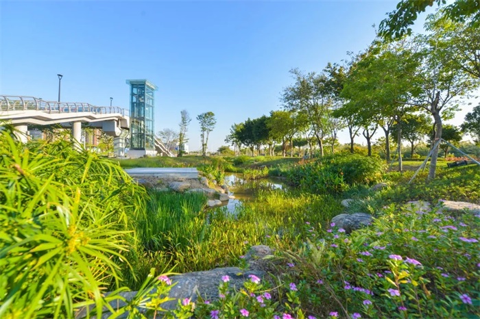 西江新城自南向北的三个功能区已有一批以“水”为主线的生态景观项目。为了充分展现城内丰富的水元素,我们在智湖站站台出口处设计了一个精致的湿地景观,这也与高速出口处的海绵湿地交相呼应。