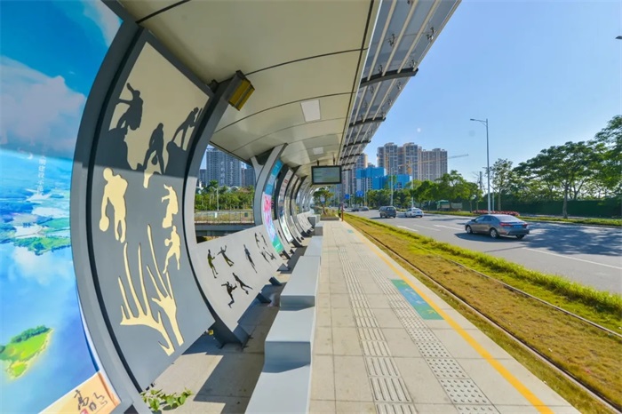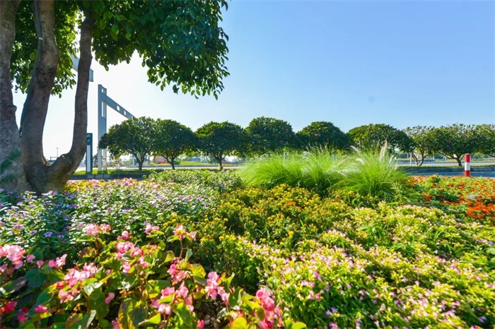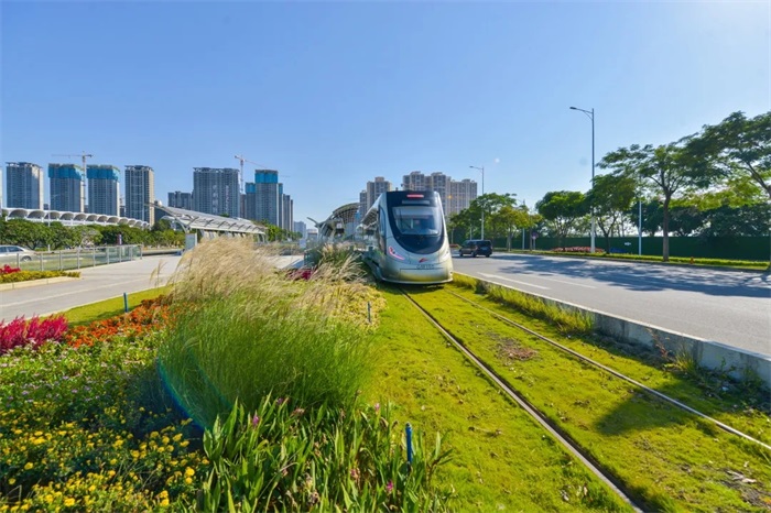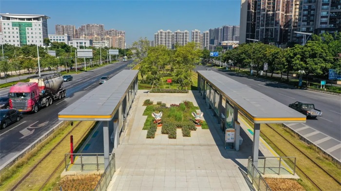 此外,有轨电车站台的中分带是视觉的聚焦点,我们铺设了色彩热烈的流线型花带,在轨道两侧种植大量宫粉紫荆,打造出色彩热烈的门户景观。