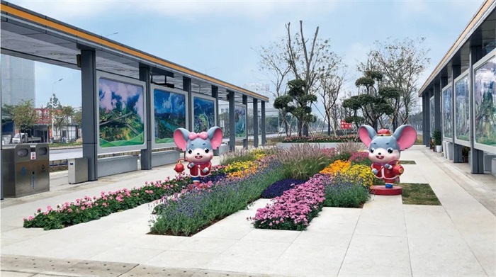在站台的绿化带中,我们选用多样的时花打造出色彩缤纷的花境,暖色系的花朵即便在冬天都能给人元气满满的印象;在正对站台的绿地,我们通过设置构架,并搭配乔木花境,丰富了有轨电车沿线的景观。