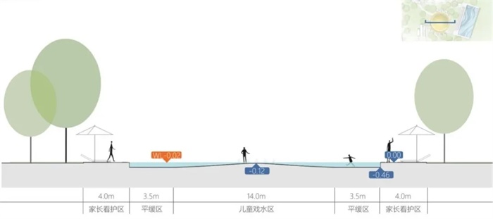 在风格和表达方面除了创造更多的纯粹和生态,同时设计也保持了理性和功能,池底中央微微隆起,呈现中心高边缘低的形态,中央浅水区结合涌泉设置,高低涌动的泉水与变化的池底水深给孩子们带来有趣的戏水体验,唤起清爽和愉悦的心理反应,即便是独自一人也可以在这里找到可以互动的伙伴。