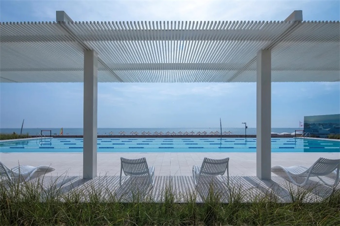纯白色遮阳伞和躺椅响应着泳池欢快的明黄,带给这里些许清凉。无边界感的池边与地面组成互相关联的点面关系,与白色沙滩色调相近的仿芝麻白陶瓷砖铺装围绕圆形柠檬泳池贴合铺砌,向滨海方向延续衔接着成人泳池,泳池以流畅的矩形图形布局,与开敞的草坪互相穿插排列,池水与海岸线连成一片,构成完整的画面却又不会抢夺海的风景,同大海包容下人们所有的情感。