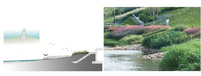 增强河道蜿蜒度,营造水岸多样化生境。在茅洲河光明区左岸科技段(公常路至风景北路),河道内现存若干片较大规模的滩地,由于下游水闸的拆除,导致该河段常水位下降,滩地趋于陆地化,且地形平坦植被单一。我们充分利用现有滩地,通过土方的调整,打造溪流、草泽、筑岛、洼塘、花海等不同的水岸空间,为底栖类、鱼类、鸟类、昆虫和小型哺乳动物提供良好的生存环境和迁移廊道。