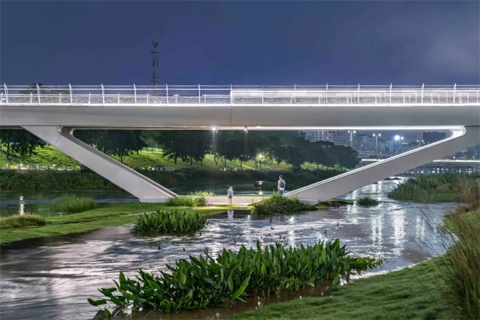 改造前的茅洲河沿岸几乎没有可亲水戏水的空间。沿河道路与河流常水位、河道内的滩地都有较大高差。我们在营建多样性生境的同时,也为市民提供了亲水戏水的机会。以缓坡地形衔接沿河路与水岸,孩子们通过草坪来到水边,光脚踏入小溪挖田螺、捉小鱼……这应该是最快乐的童年时光吧!