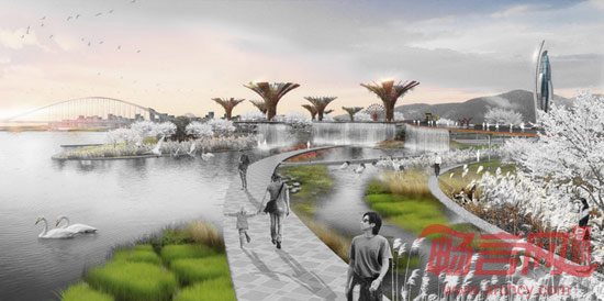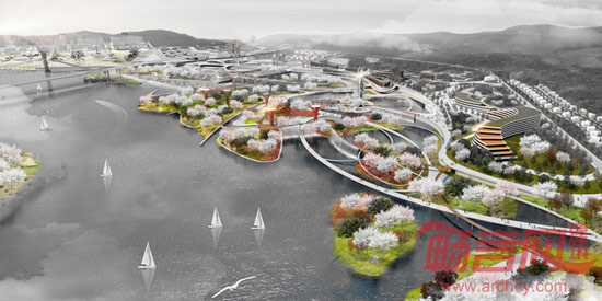 由于掠夺式的人工采砂活动,场地内滨水自然生态环境受到了严重破坏。毕路德通过景观化处理与一系列生态技术的运用,将现状河床中人工挖沙所形成的地形打造成极具生态体验性的浮岛状湿地,使得破坏的生态环境得到极大的修复与改善。同时在湿地公园内部置入水上娱乐、风情商业街、高端度假酒店等功能齐全、设施先进、服务一流的旅游度假功能。各功能间通过观光小艇、浮桥、栈道等多样化的交通形式进行连接。