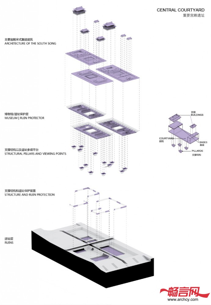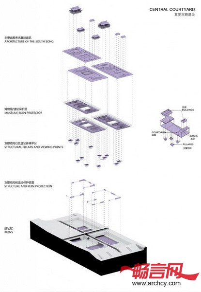 IAPA公司的设计方法是,建造一些新建筑,让它们架空在遗址之上,用来遮住并保护遗址。这些架空的建筑不只设置为博物馆,还有几个观赏区域,这样人们就能观赏下面的宋朝皇城,也可以亲身体验其中几个宫殿和庭院。