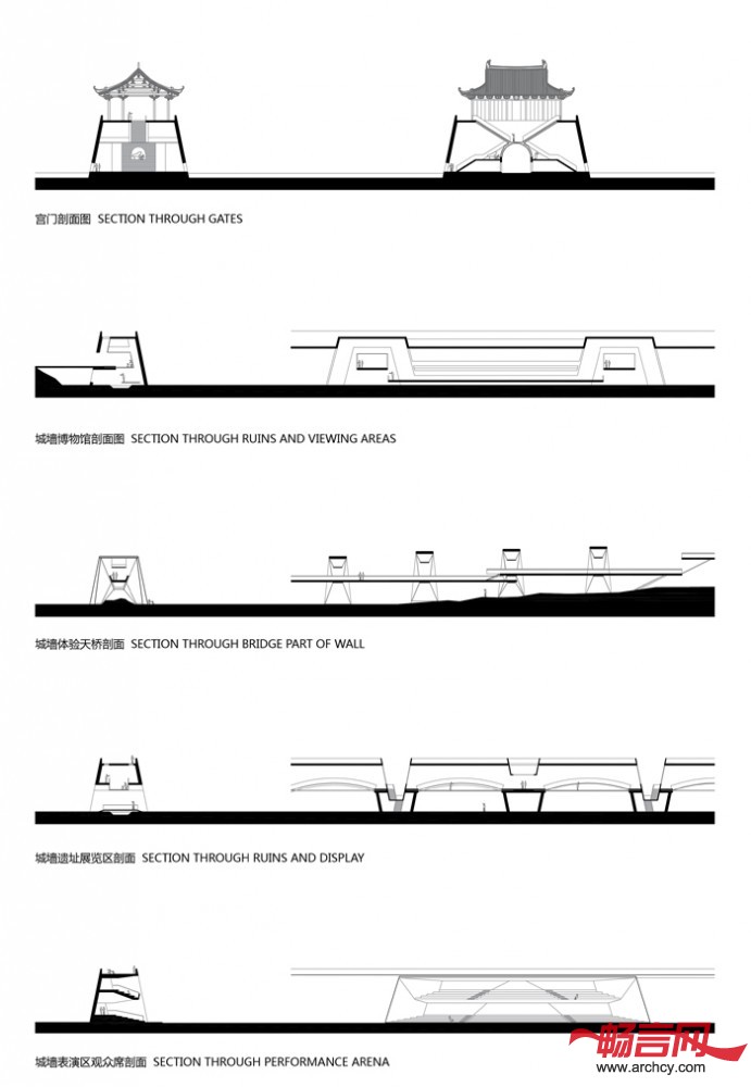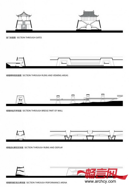 在古代,城墙是防御建筑,它将墙内和墙外的事物隔开。如今,城墙已不复其防御作用,而我们则更喜欢把它看成是连接墙内和墙外世界的纽带 --- 一个将宋朝皇城和城市连接起来的纽带。所以,在设计时,我们参考了古代城墙的大小和形状,同时在考虑到保护原址的基础上又再建了一些墙壁,并在里面添加一些建筑。