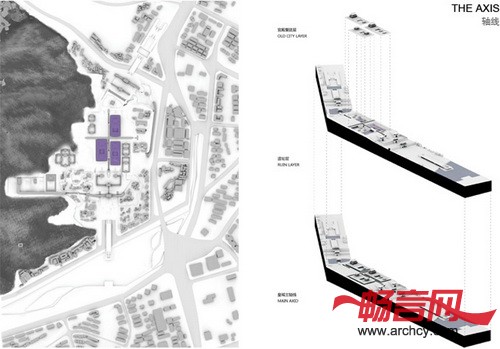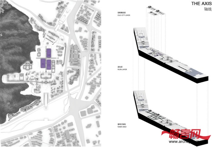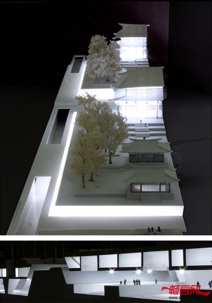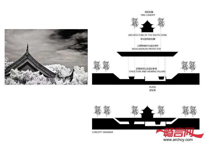 遗址公园由城墙和小村庄包围着,在公园的三个架空建筑里有一个博物馆,它位置在宋朝遗址的上面、宫殿和庭院的下面。一条很明显的建筑轴线将博物馆与遗址公园连接起来。人们能在景观、宫殿和博物馆空间下面看到古代遗址,这就将古与今生动的联系起来了。