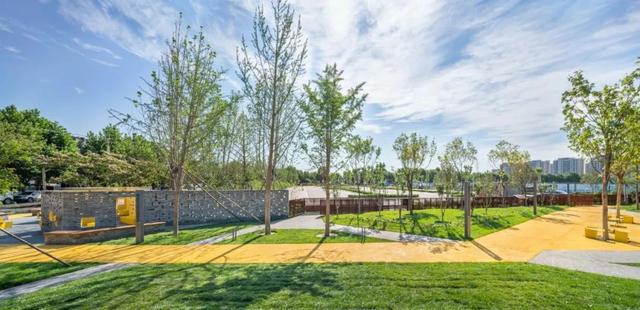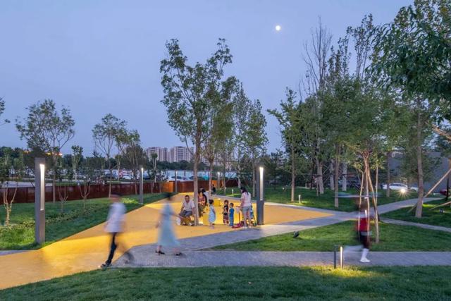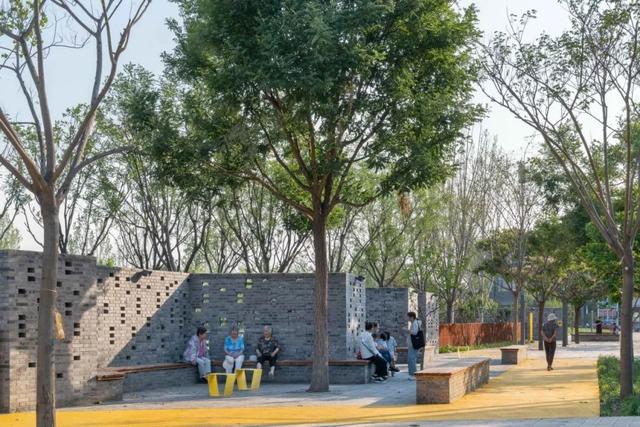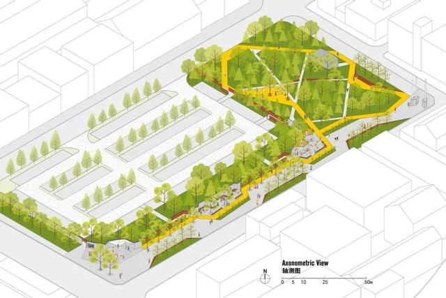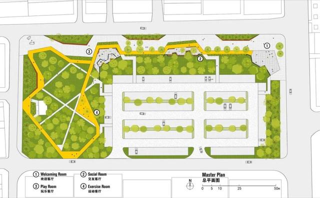在这片L型的场地上,路边人行道和公园之间以一系列户外“城市客厅”连接, 蜿蜒前行,并沿着道路带动着周边的烟火气。“城市客厅”之间有着黄色漫步道 联系,并使得不同的公共区域连成一个整体。这条小路一直贯穿着小公园,描绘 出了一个更加自然的景观。法桐树和银杏树与前面有组织的“城市客厅”遥相呼 应。因为有黄色的漫步道,这些“城市客厅”有着自己的层次:首先是如同前奏 一般完全开放的欢迎客厅,然后是半围合的社交客厅,再到有着趣味游戏房的玩 耍客厅,最后是一个多功能的体育休闲客厅,室外空间沿着客厅不断延申。