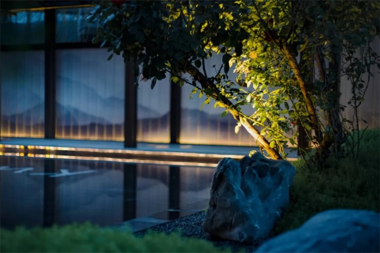 取水于场景之中,环水的光影通廊与两侧透过U型玻璃所呈现的朦胧水墨山影,如洗尘于诗情画卷之间。水与石、与景相映成趣,自然山水意境在这里展现的淋漓尽致。