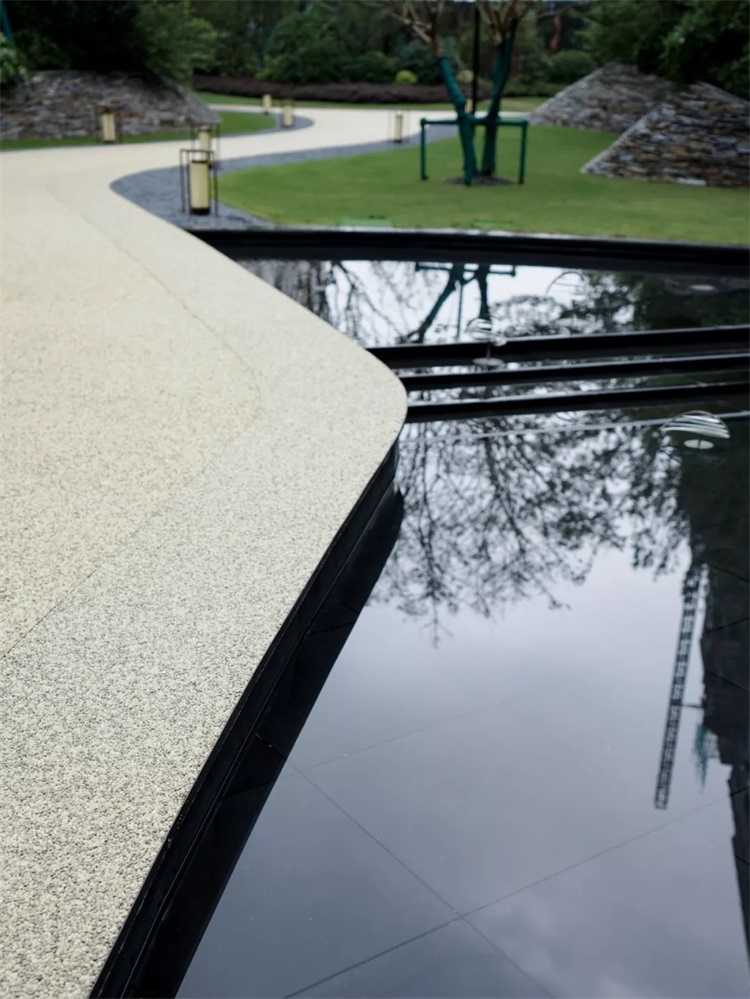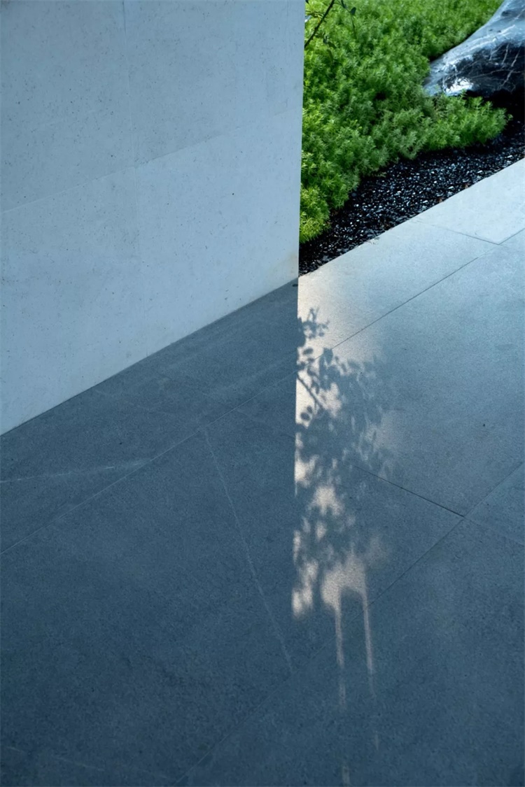 自然味十足的板岩,优美的曲线起伏结合,生机勃勃的绿化,趣味精致的跌水。以及在夜间诗意般的画卷发出了温暖的柔光,诱使人忍不住想要触摸。曲折的洗米石路与板岩堆砌的起伏矮墙映入眼帘,纯净的色调、蜿蜒的道路令人心生期盼。