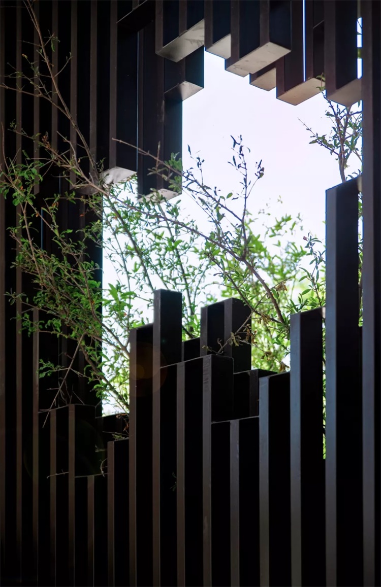 镂空处更有墙外树枝延伸而入,自然的气息也被引入其中。