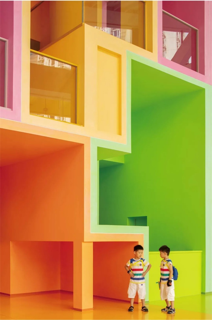建筑立面系统采用的黄色、橙色、粉色和绿色也反映出建筑不同的功能空间。裙楼的丰富颜色传达出这栋大厦主要为妇女儿童服务的功能目的;塔楼的高层区域设置了酒店配套,采用了更加中性的白色立面。在地面层,建筑的四个主要入口采用了不同的颜色区别,各自发挥了引导作用,同时用欢乐的颜色和亲切的氛围欢迎来到这里的人们。