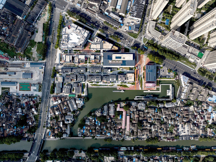 场地内,几座残存的厂房构架成为一种遗迹式的存在,宏大的巨构和古运河边鳞次栉比的老房子形成鲜明的反差。在城市道路的另一面,则已经形成了新的城市高层社区。在这样一种多重界面、多种尺度、多重文化并存的基地上,如何将一处工业遗存活化再生为以文化商业和游客中心为主体的城市活力片区,是一个非常有挑战的命题。