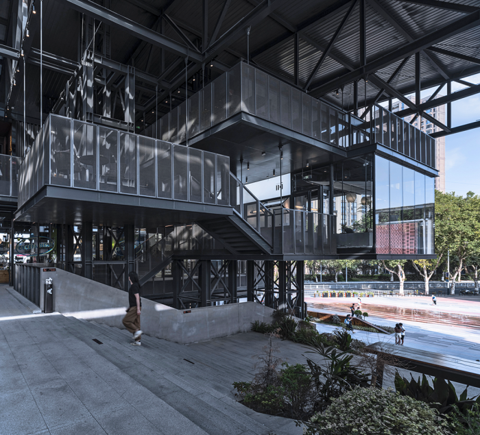 建筑内部嵌入了一个十字轴空间体系,一方面清晰划分了公共空间和功能空间,另一方面则成为了项目整体十字形空间主轴在建筑内部的延续。其中公共部分为3层通高的发布大厅,大厅内部裸露的混凝土排架柱、耐候钢板以及上部的屋顶桁架充分体现了结构和材料美感。