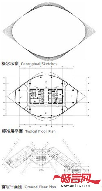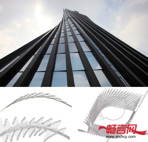 总部大楼的立面构成遵循着一个简单的原则,外立面的柱按一定的角度连接顶层和底层的外轮廓线。尽管所有的柱子都是直的,但围合的外立面却是一个动态的三维立体双曲面。