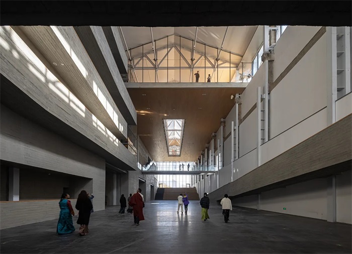 西藏美术馆的总体设计策略,是试图平衡拉萨城市东西两翼日渐失衡的空间与文化发展状态,成为拉萨西部的公共活动中心,其开放式布局整合考量了场地发展的可能性,塑造出充满想象力的城市愿景。在社区贡献方面,美术馆的分散布局使教育和商业等公共设施能够更充分地满足周围社区的需求。这是一个不仅适用于艺术爱好者的空间,也是适合所有人的空间。在工业遗产保护方面,水泥厂的工业记忆没有丢失,而是在新的艺术空间中保存完好。叠加时间线索的空间魅力显而易见,昔日的工业生产线已经转变为激活城市艺术活力的引擎。