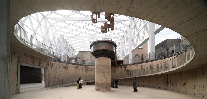 老水泥厂原有的水泥生产线保存较为完整,厂房建筑单体和各种设备散落分布于整个场地内部,我们在详尽地勘察厂区建筑及设备现状后,通过对新老空间的重构,重新编织空间完整和体验共享的新叙事。新的设计融合了工业遗产的分散布局,巧妙地将美术馆的主要功能分解为集中的主展馆与围绕主馆的三个配套附属区域,形成四大分区。