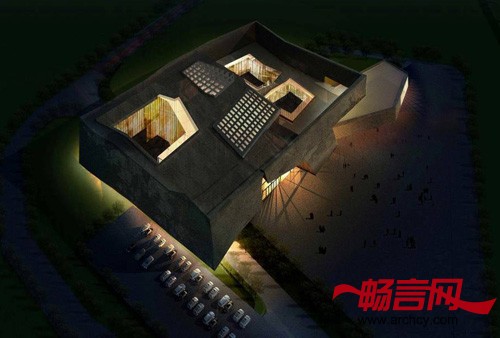 从主入口方向望去是有力量的斜线组合和面飘在树梢上的鄂尔多斯大地景观的抽象雕塑,巨大的黑墙衬托出单纯树林(影子)的力量感。在建筑成为环境一部分的同时,树林/蓝天/湿地也成为建筑的重要组成部分。