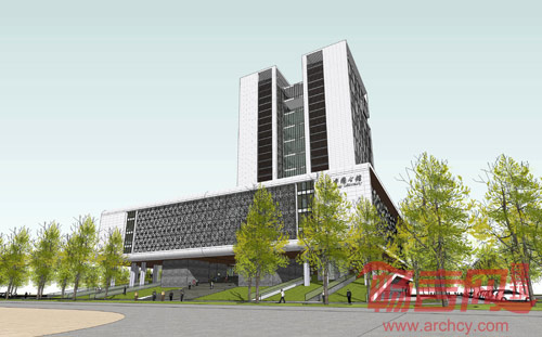 本案中建筑师以抽象的辞典和书架作为建筑形态中裙房与高层的形态写意,以“活字印刷”玻璃幕墙作为主要的立面肌理。