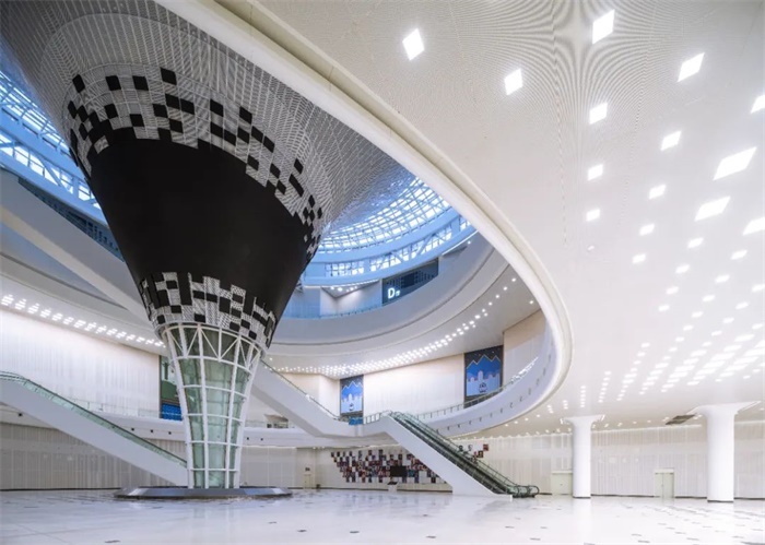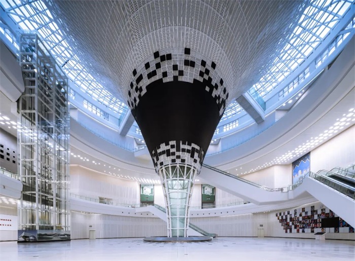 面对复杂的场地环境,建筑以不变应万变:从中国传统哲学思想“天圆地方”这一概念发散开来,选择用简洁几何形体应对复杂的场地条件。具体到科技馆本身内涵,天圆地方和螺旋元素还隐喻着生命和宇宙观的不断生长。植根于湖北地域文化,方案创作提取了以湖北人毕昇发明的“活字印刷”作为设计概念,使其贯穿于空间形态塑造之中,产生不同于常规科技馆展览空间与公共空间串联构成的新秩序。
