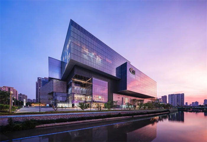 并在三层以上做退台,形成绿化景观及商业外摆,以便增强消费体验。面向水岸的街区与商场的临水界面,共同成为了绿轴公园一个向上的延伸,也更好地契合了新一代温州人对空间公开性与品质感上的诉求。最终成为了一个结合水,景观,现代商业与办公相结合的范本,为这座活力城市的新兴空间提供了一个积极的解决方案。