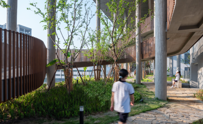 教学楼被抬离地面,把地面的空间彻底腾了出来。剧院、图书馆、体育馆、食堂就像小店铺一样散落在街道的两旁,进入这些公共空间就像逛街一样,随时进进出出,没有太强烈的“仪式感”。