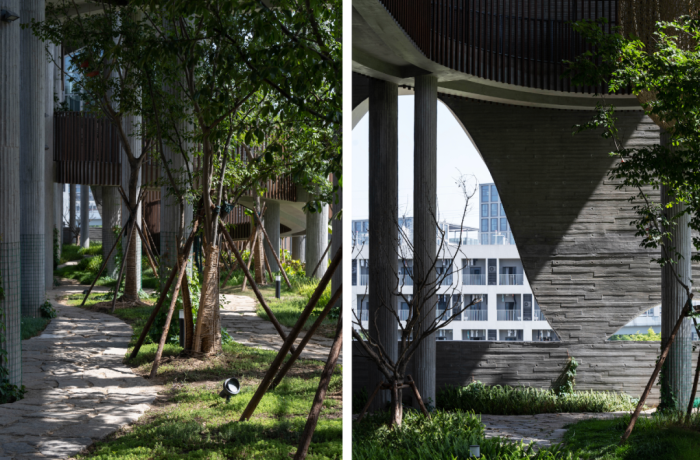此外,惠贞森林景观空间处还融入了东西方美学设计理念,采用清水混凝土,浇筑后极具装饰效果,呈现天然美感,且墙体没有任何外部涂装材料,绿色环保。几十根廊柱,也都采用了手工“竹节”印刻的方式,以打破传统建筑模式的创意设计,既美观也为整体空间增添了艺术气息。
