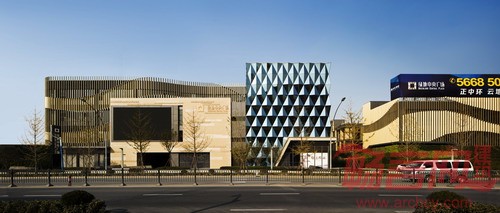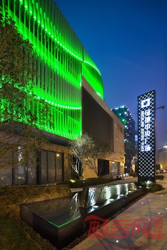 玻璃、金属和石材是立面设计中主要运用的建筑材料,玻璃的冷峻、金属的精致和石材的硬朗恰好迎合了高新技术产业园的“高、精、尖”气质。以沿街商业为例,双层的“菠萝皮”部分由菱形网格结合玻璃幕墙构成,体量清晰简洁,可识别性强;而曲面状的“浮云皮”由竖向杆件通过旋转和色彩变化,形成漂浮云效果,在夜间通过灯光变化实现绚丽多彩的效果。