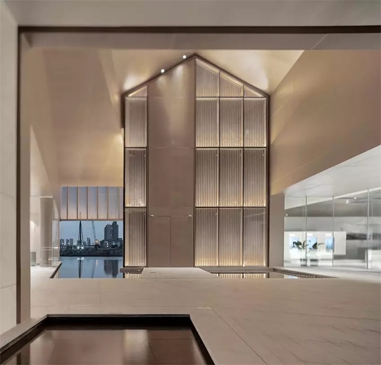 因基地狭长且共享入口,出于对人流动线的引导,加入交错坡屋顶体量,强化入口中心区域,并丰富建筑形态。坡道两侧密植修竹,与建筑格栅元素的光影婆娑交映,访客体验情绪铺垫后达成空间的转换,观览面向运河的开敞全景。两侧室内区域设置无边框长条宽荧幕大窗,将运河及对岸城市景观纳入框景,充分利用了运河资源。沿河展开的室内界面错落灵动,步移景异中可走出室外,深入贴近滨河场景。