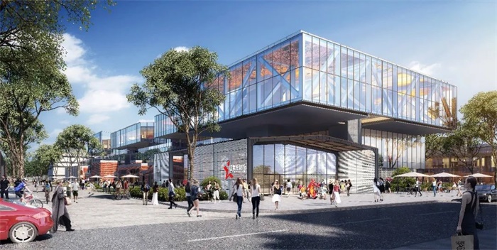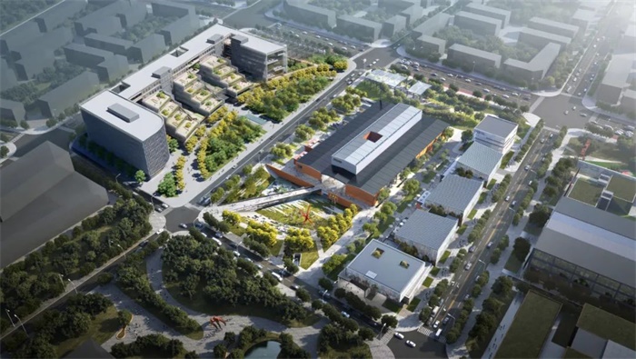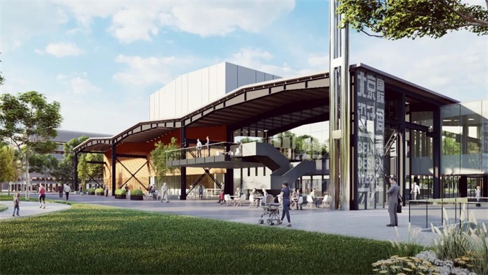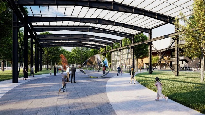 局部保留的现状厂房框架,将被打造成设计周室外展场,通过在屋顶增加半透明式开合屋面,来应对室外多变的雨雪天气。绿化与展场内外交织,充分融合,体现绿色生态设计理念。
