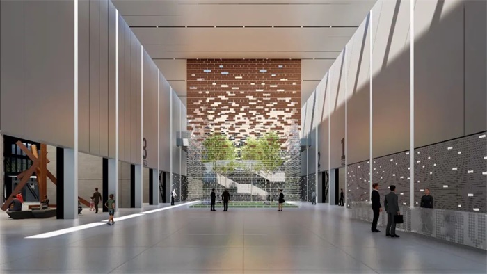 14m净高的展馆门厅可以满足大型临时艺术展览需求;正对入口的绿化庭院墙,采用玻璃砖与红砖融合砌筑的方式,寓意新旧古今的交织融合;阳光从墙体与屋面之间的缝隙柔和洒下,构成独具艺术性的光环境。