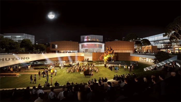 夜幕降临,下沉广场将成为一个汇聚人气的视觉焦点。面向主入口的方向设有围合场看台,可以举办音乐会,发布会,时装秀,设计周期间也可以作为开阔的室外展场使用。