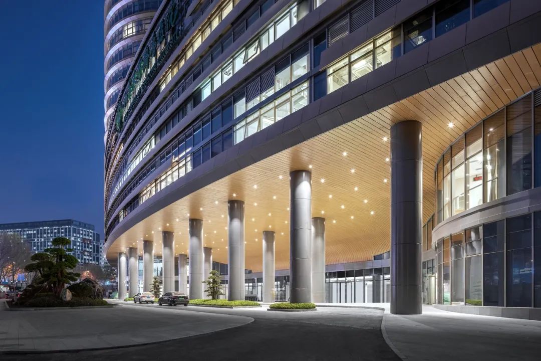 该项目用地形状近似一个有缺口的三角形,南侧紧邻山东大学趵突泉校区,北侧靠近趵突泉公园和泉城广场,是济南市重要的历史文化空间节点。建设用地面积约为 23,800㎡,南、北两侧用地的高差约为 6m,建筑限高 60 m。另外,项目处于趵突泉泉域汇集区,地下开挖深度受限。在高容积率、低限高、低限深的情况下,本项目通过层层逻辑推导,因地制宜,采用流线型三角形双塔楼布局策略,在双塔之间形成视线通廊,巧妙地避免其对老住院楼造成视线干扰。