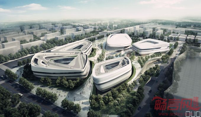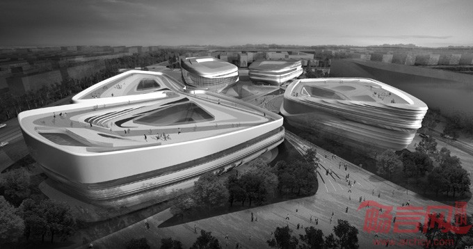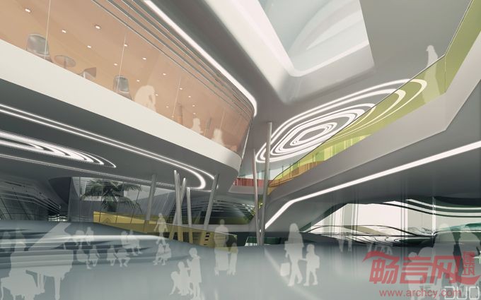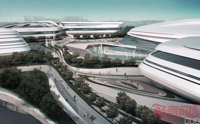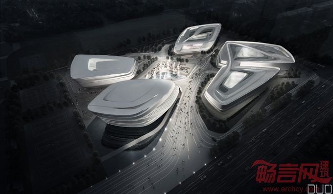 四中心在场地中央围合出中央架空广场,来自东北角(地铁方向)与西南角(区政府方向)的两条坡道将场地贯穿,形成开放的城市空间。架空广场向东侧缓缓坡下,与水面及户外运动场地融为一体。