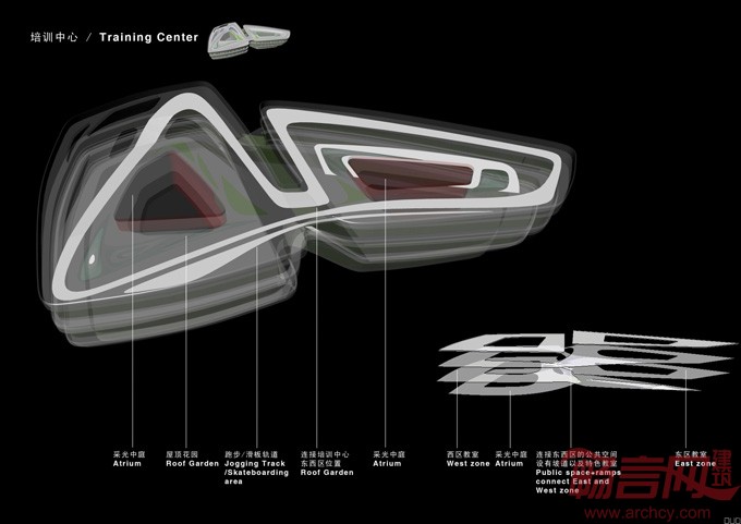 大连青少年活动中心由艺术中心,培训中心,运动中心和体验中心四部分组成。四中心分别位于基地的四角,艺术中心位于东北角,坐落于大面积的景观水面上,由剧场,展厅,水面舞台组成。体量较大的培训中心沿西北角向东展开,为场地中央在冬季阻挡强风。体育中心位于东南角,内设有体育馆,游泳馆,并与场地边现有的塑胶运动场紧邻。体验中心位于西南角平台上,适当的抬高后其识别性得以加强,有助于独立运营的需要。