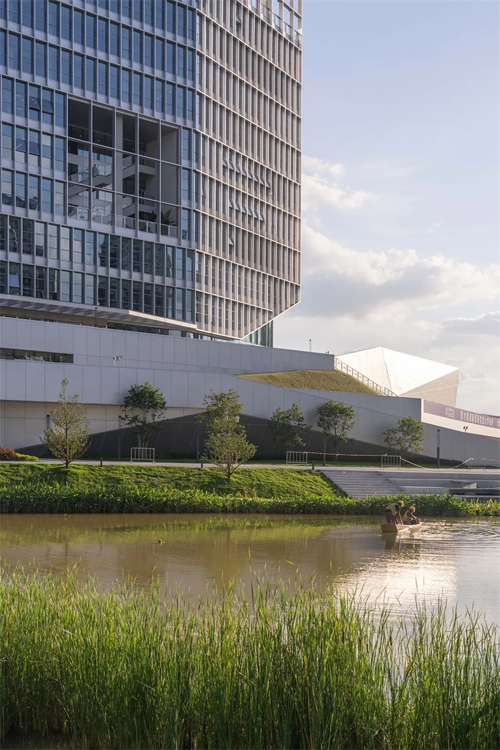 围绕着中央水轴,从北向南依次布置着体育馆、图书馆、国际交流中心和综合楼等公共建筑群。理性高效的设计语言与自然的生态环境有机结合,折叠的建筑主体于地景中自然隆起。
