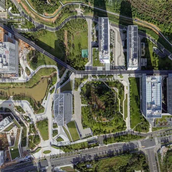 设计最大限度地保留了自然本底,依据山体原始地形的汇水路径,留出海绵绿廊,成为山水校园的生态骨架。根据该骨架,校园被划分成六个尺度紧凑、功能复合的聚落组团,学生的日常学习、科研和生活得以在五分钟步行圈内实现。