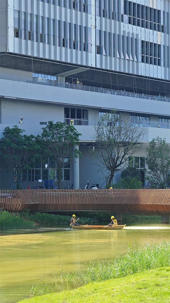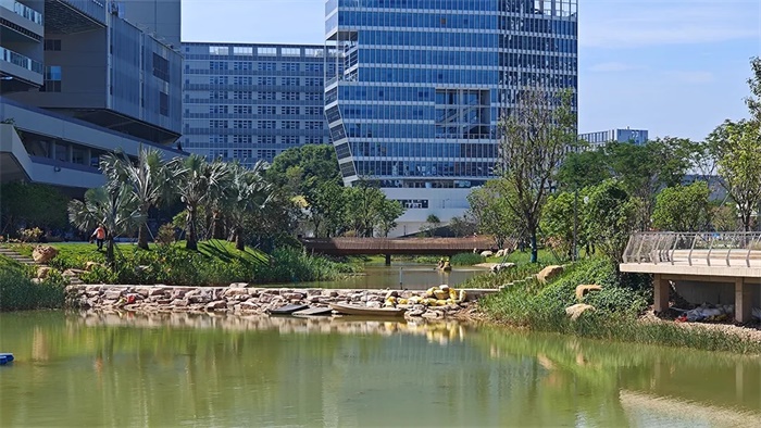 场地中央原有的罗仔坑山塘,被转化为南北连通的核心水体空间,成为校园颇具吸引力的中央水轴,同时也是海绵校园重要的生态基础设施。