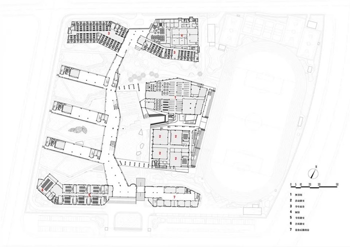 为满足校园对外界形象以及人流疏导的需求,入口设有两条入校路径,或沿阶梯向上攀爬,或由入口广场进入校园,广场空间方正简洁,体现了现代进取型校园的风范。乐礼广场占据校园中心位置,其中置入模拟山水形态的石块,成为“绿谷校园”的抽象演绎,室外阶梯横亘于庭院中,使人如同处在山谷。生活广场尺度宜人,与其他教学楼之间的庭院组团构成了“片状的自然”,以盎然绿意激活学生与教员们的身心。