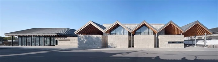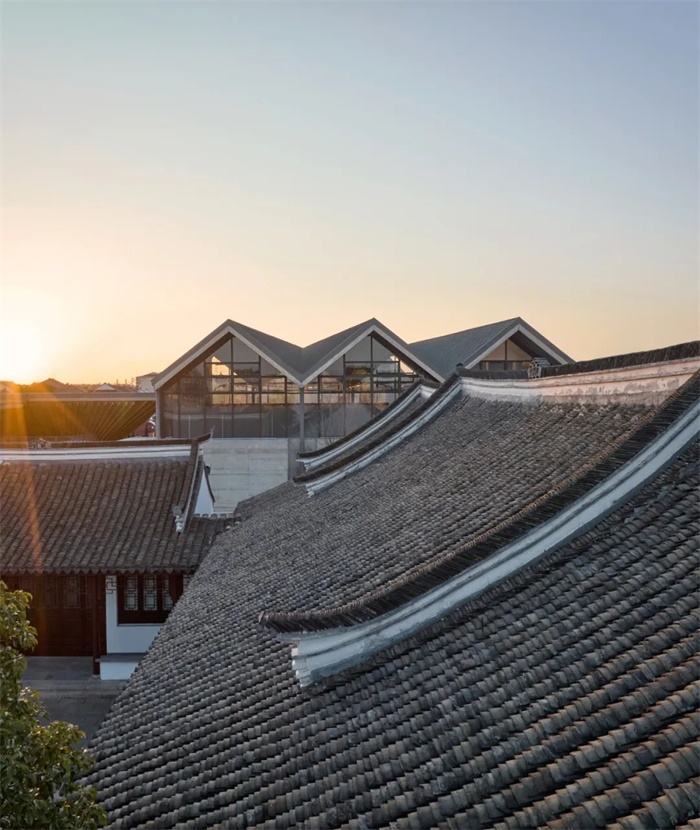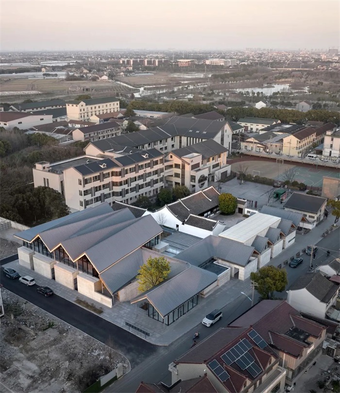 设计延续既有建筑的尺度特征,以旧址布局作为线索生发,向场地西侧和南侧对位延伸,形成两组体量相近的连续坡顶群落。转角处,两组新生的屋檐扭转融合,形成“纽带”柔化街角,围合成对城市开放的两处共享院落。