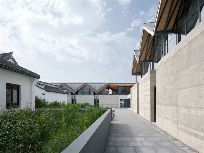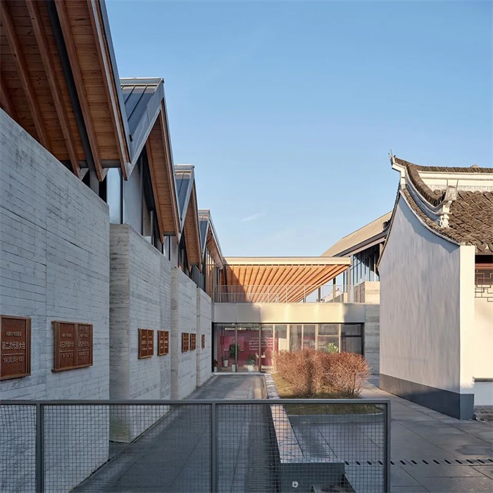 扩建建筑围绕县委旧址呈 L 型布局。在满足保护建筑各项要求的前提下,新老建筑之间围合成六组连续融通的庭院空间。内向院落用以容纳不同的户外展览交流活动,如少先队宣誓活动等;外向院落为市民开放,日常共享。设计将建筑群主入口调整至基地东南角,挑空的入口檐廊呈现新旧关系的同时,也方便组织交通、为街道提供邻里友好的等候场所。