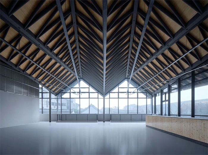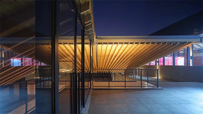 南侧建筑群以钢木结构为主要受力体系,旧址的梁架结构通过现代建造技术演化,连绵起伏的屋檐与序列有秩的柱廊相得益彰。西侧建筑群以钢结构为主,为满足展览跨度需求,顶部形成完整的空间网架;两侧檐口对位交错,回应场地。角部“纽带”钢木混用,曲径通廊,完成西侧及南侧的结构衔接与转换。