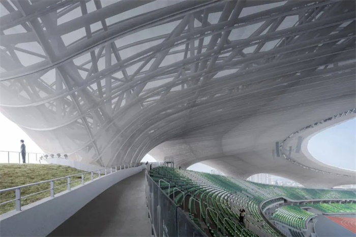 建筑事务所 MAD Architects 在衢州完成了一个盘曲的混凝土体育场。这个体育场嵌入地下,屋顶上覆有草场。这座 33,731 平方米的体育场被视为“一件大地艺术”,可容纳 30,000 人。它的内部被 MAD Architects 描述为“类似火山口”,有起伏的座位,旨在呼应周围的景观。