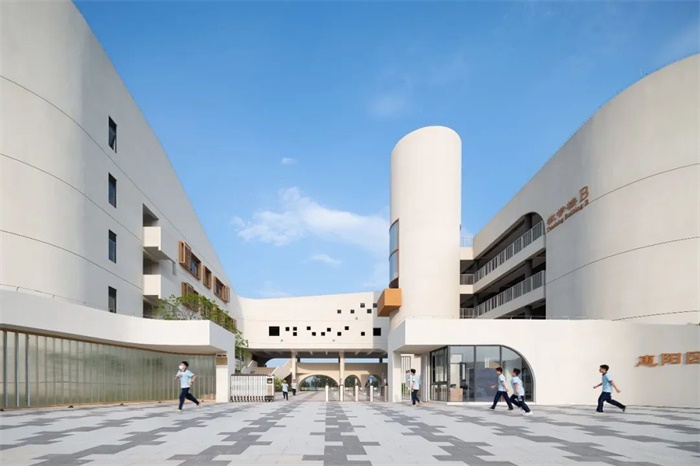 我们设计了一条蜿蜒跌宕的线性建筑,与山峦、小河对话,并把校园分隔为一个个半开放的庭院,取意“九曲园”。建筑群面向东侧运动场呈开敞的姿态,让校园内部空间联通渗透;而在北侧和西侧主要道路面,建筑贴线塑造了街廓边界,并自然形成两个内凹的院落,分别作为小学和中学主入口。中小学分为两个区域,日常上下学互不干扰。