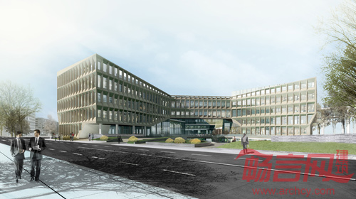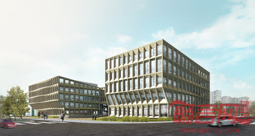 开敞空间交汇处的体量被抬高,令地面步行交通贯通,联结西面主入口,南、北面公园绿地和中心庭院。三个庭院被塑造出不同的性格:中心庭院作为人流汇聚点最为开放,也是公众活动集中的场所;南面的庭院联系中心庭院和东侧的公园,是半开放的景观庭院;北侧的庭院是由建筑围合的水院,为办公提供静谧的场所。三个功能体量作为三个主要的办公空间,既可以被独立地使用,也可以联结成为一体。他们由空中廊桥分别在二,三,四层联系起来,人们可以通过连廊在不同庭院之间游走。局部五层的办公楼结合屋顶花园,提供远眺城市风光的平台,也可以欣赏近处的景观和庭院。独特的建筑立面由模块化的遮阳屏板组成。屏板在水平向的渐变赋予了立面的流动性。这些不同斜度的屏板也改变了窗户的高度,控制室内空间的采光。